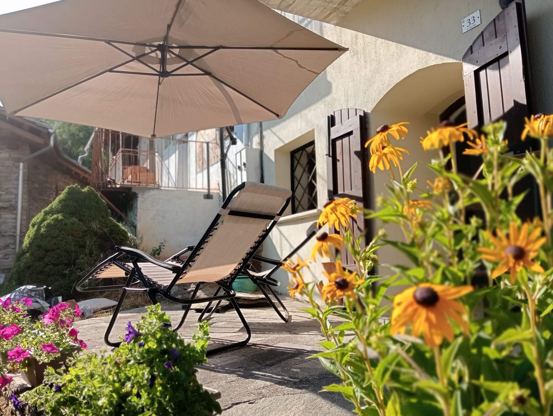 The outdoor area, usable all year round, features a table with 4 chairs, 2 comfortable deck chairs, and a large umbrella. In summer, it is adorned with colorful flowers, creating a truly relaxing corner.